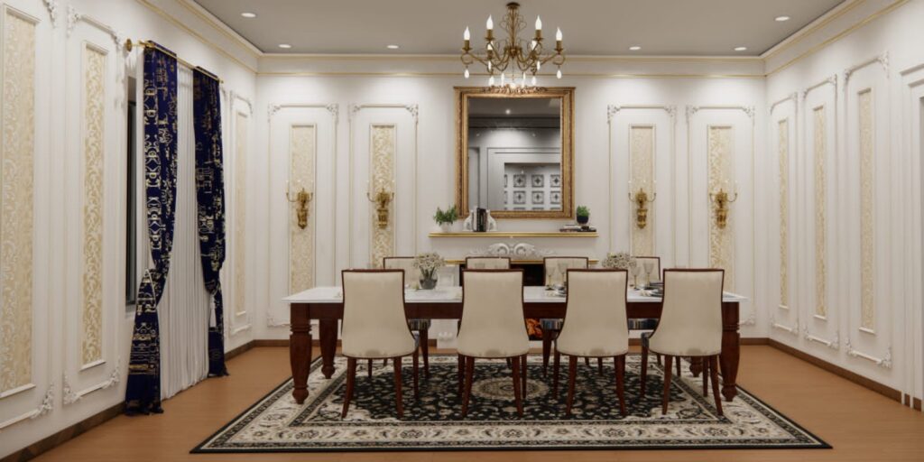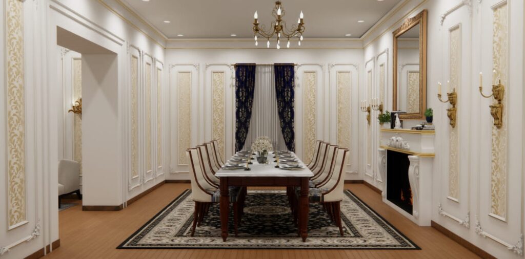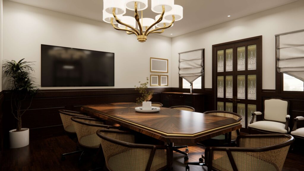 Designed a formal conference hall with timeless, classical interiors that convey authority and gravitas. Rich wood paneling, coffered ceilings and elegant mouldings, paired with plush seating, refined lighting and integrated AV to create a dignified setting for high-level meetings and presentations.